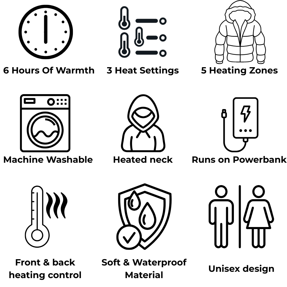 It is a waterproof and windproof bodywarmer with effective heating zones that work on a power bank. Press the button and enjoy instant warmth, whether you are going hiking, camping, or stepping out on a chilly morning.